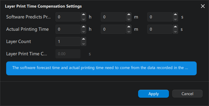 -99.99and99.99with default set at0s.When enabled, the Estimated Time For A Single Layer = Exposure Time + Waiting Time + Movement Time + Layer Print Time Compensation