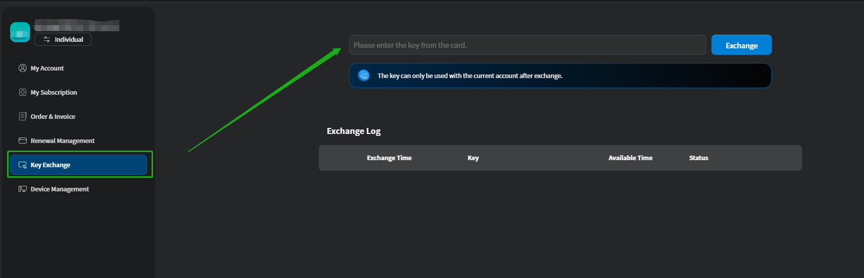 Enter your license key and click on the Exchange button to activate the license key and bind it to your computer. The effective period of the key starts from the day the key is activated.