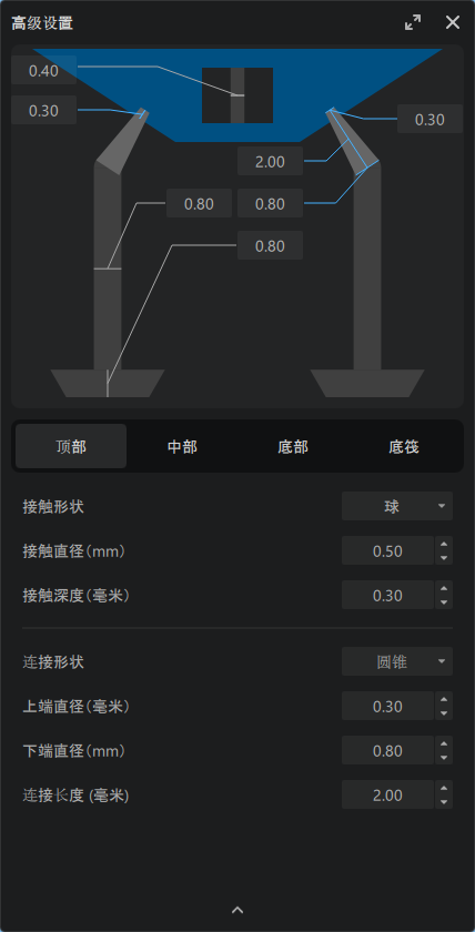 高级设置分为 4 个部分:顶部、中部、底部和底筏。