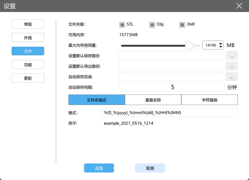 自动保存间隔:自动保存的时间间隔。CHITUBOX 会在自动保存目录(默认为日志路径)下生成一个临时的 .chitubox 文件。如果 CHITUBOX 正常退出,则该临时文件会被删除。 -