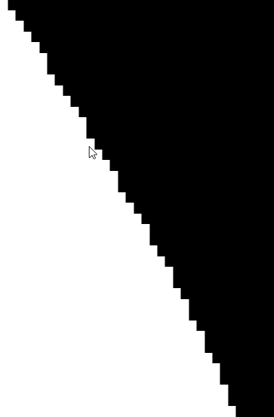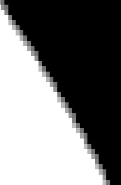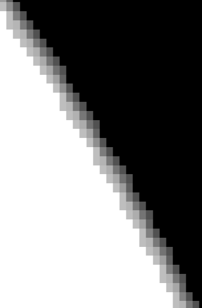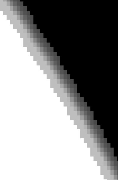 灰度从左到右逐渐变灰,这是因为原图上的每 51 个像素灰度被平均了。 以第一行的情况举例说明。第一组 51 像素的灰度是 50 个黑像素和 1 个白像素的平均值,因此结果会比黑色略浅一点点,虽然这个改变几乎肉眼不可见。第二组 51 像素的灰度是 49 个白像素和 2 个黑像素的平均值,因此结果会比白色略暗一点点。第三组 51 像素的灰度是 48 个黑像素和 3 个白像素的平均值,依此类推,直到最后剩下 35 个白像素。