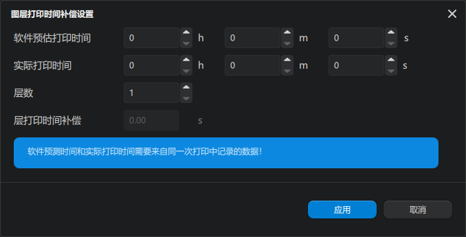 -99.99到99.99之间,默认为0秒。 当启用时,单层预计时间 = 曝光时间 + 等待时间 + 移动时间 + 每层打印时间补偿 -